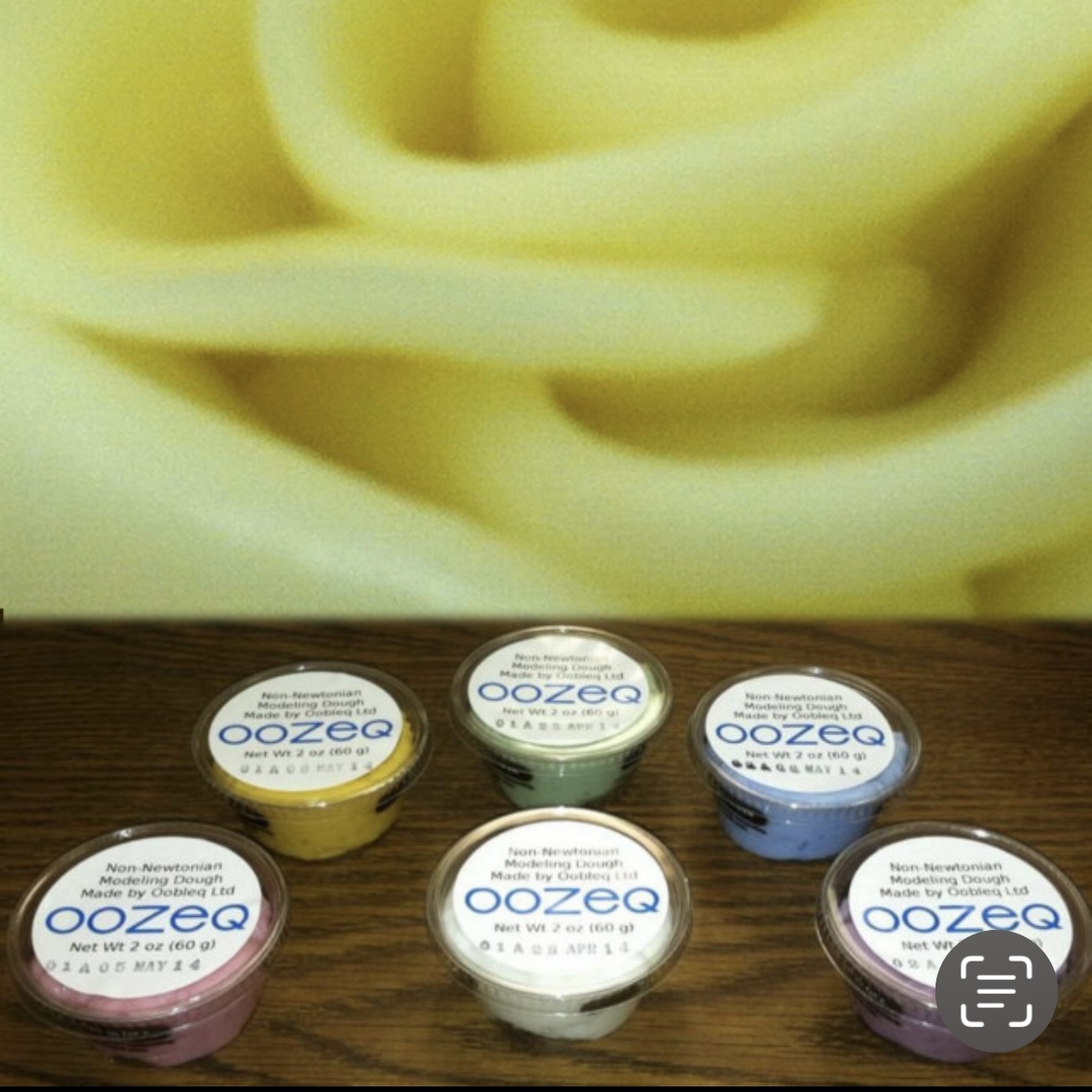 Oozeq is a stable, patent pending, starch and water gel. Like oobleck, Oozeq will stretch like liquid when pulled slowly, and break like a solid when torn quickly.